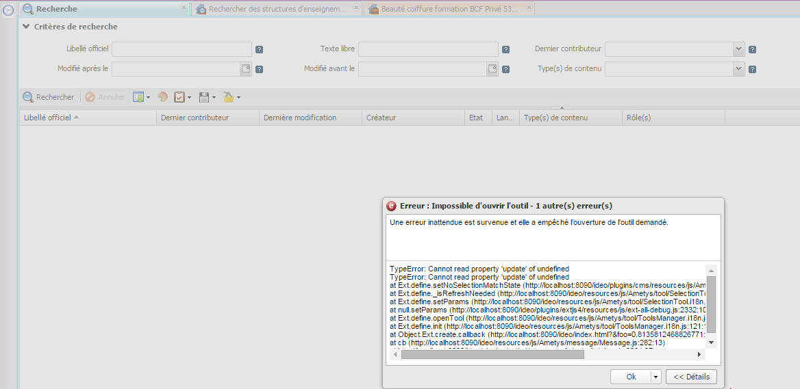 2015-01-16T16:18:52.920+01:00 ERROR [Ametys.message.MessageBus] Un composant a rencontré une exception lors du traitement d'un message du bus (TypeError: Cannot read property 'update' of undefined) TypeError: Cannot read property 'update' of undefined at Ext.define.setNoSelectionMatchState (http://localhost:8090/ideo/plugins/cms/resources/js/Ametys/plugins/cms/content/tool/HistoryTool.i18n.js:144:30) at Ext.define._isRefreshNeeded (http://localhost:8090/ideo/resources/js/Ametys/tool/SelectionTool.i18n.js:139:9) at Ext.define._onSelectionChanged (http://localhost:8090/ideo/resources/js/Ametys/tool/SelectionTool.i18n.js:106:12) at Ext.define.fire (http://localhost:8090/ideo/resources/js/Ametys/message/MessageBus.i18n.js:165:14) at cb (http://localhost:8090/ideo/resources/js/Ametys/message/Message.js:279:31) at http://localhost:8090/ideo/plugins/extjs4/resources/js/ext-all-debug.js:2284:27
