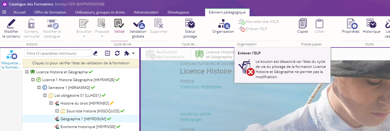 Le bouton "Enlever l'ELP" reste actif sur un ELP alors qu'une de ses formations est dans un statut de pilotage avancé. Lors du clic sur le bouton, l'action s'effectue correctement, il n'y a pas de message d'avertissement non plus.