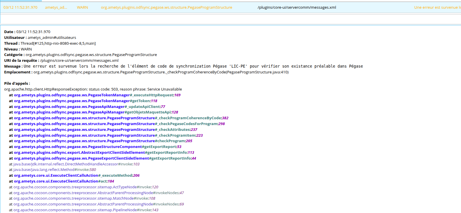 Les erreurs liées à l'export Pégase devraient être remontées en ERROR et non WARN