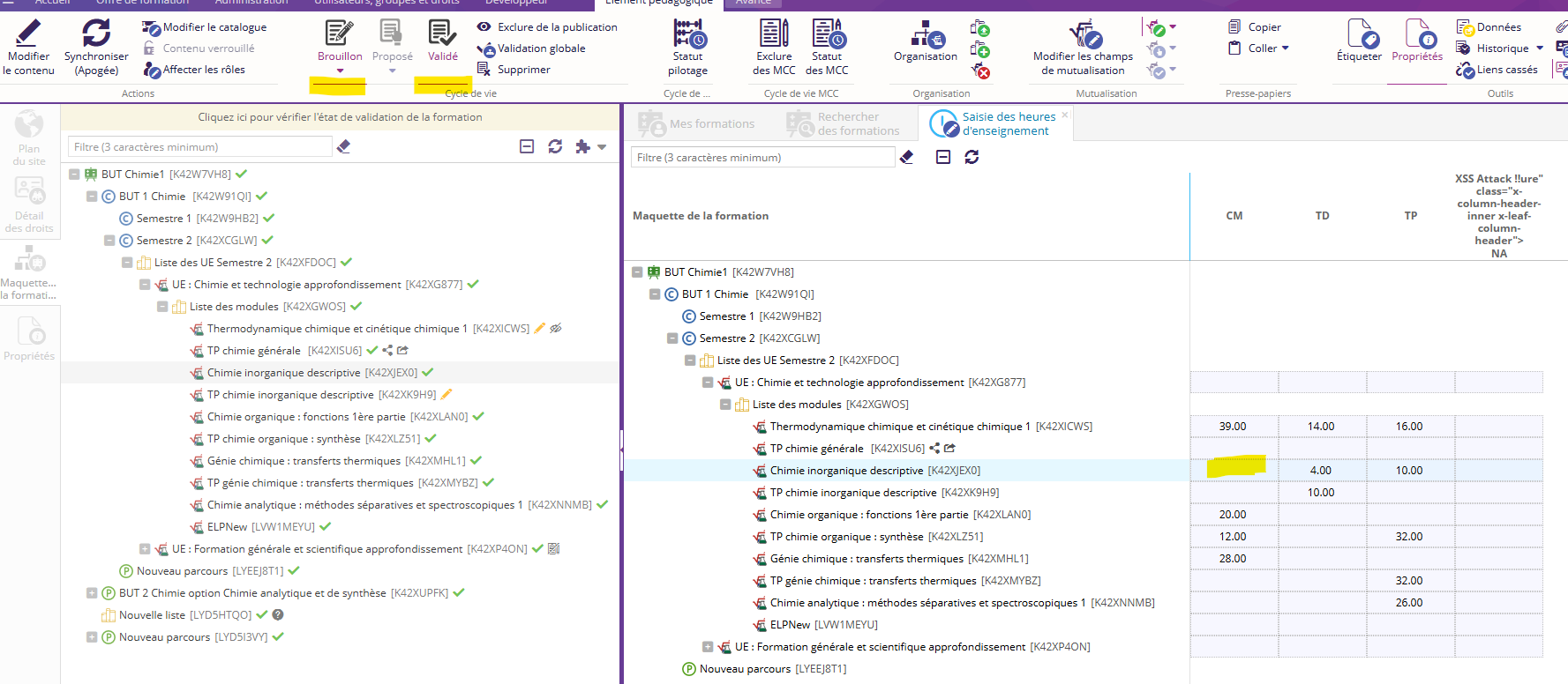 Lors de la modification des heures d'enseignement dans l'outil de saisie en grille, le statut de l'heure d'enseignement repasse en brouillon mais ne change pas le statut de l'ELP
