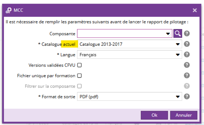 Depuis l'onglet Pilotage, quant un rapport MCC est lancé, la fenêtre ci-dessous s'ouvre :
